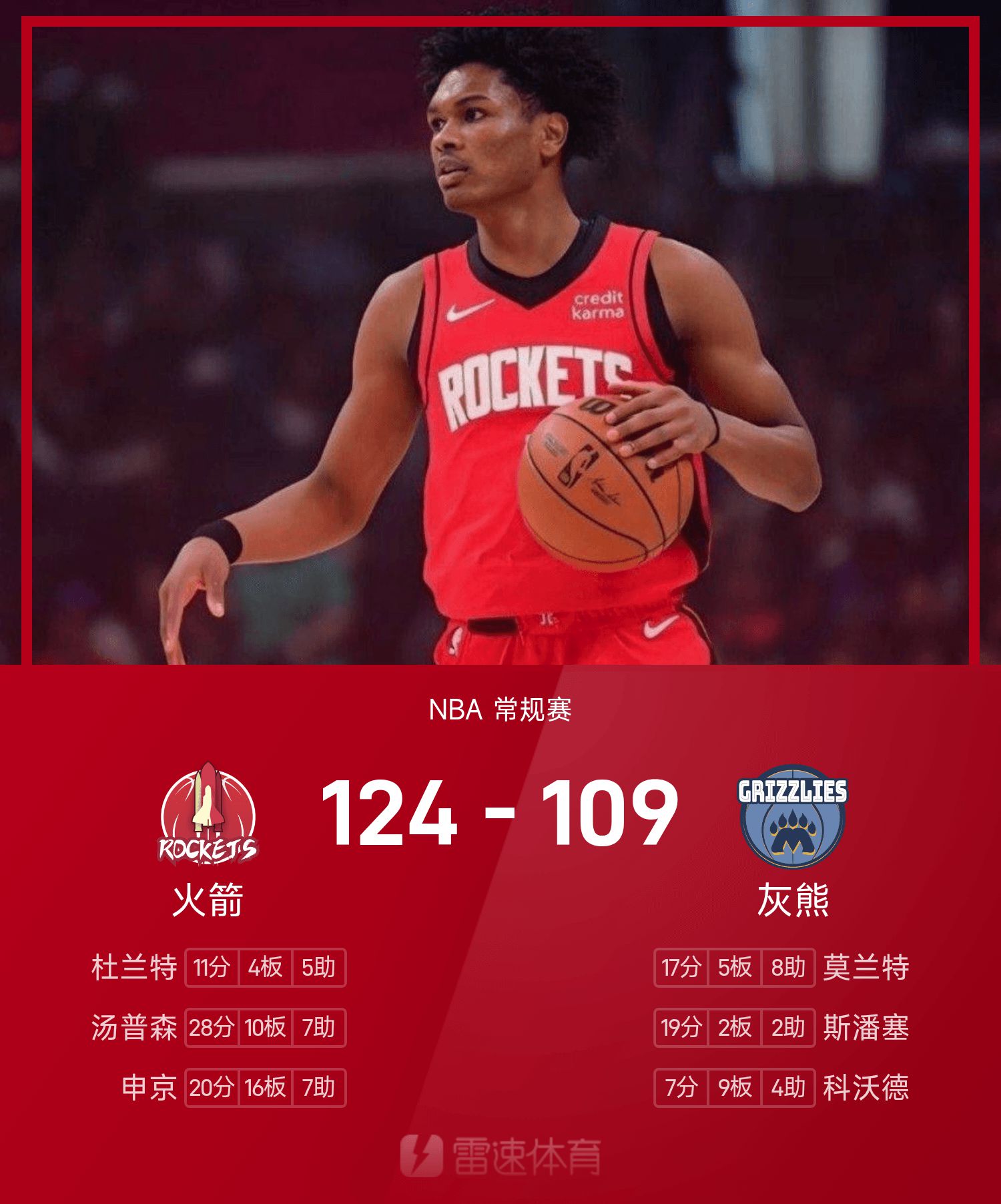 6686体育app11月06日讯 25/26赛季NBA 常规赛,灰熊对阵火箭。双方全场战罢,灰熊109-124不敌火箭。阿门·汤普森砍下全场最高的28分10板7助,率领火箭胜利取胜。