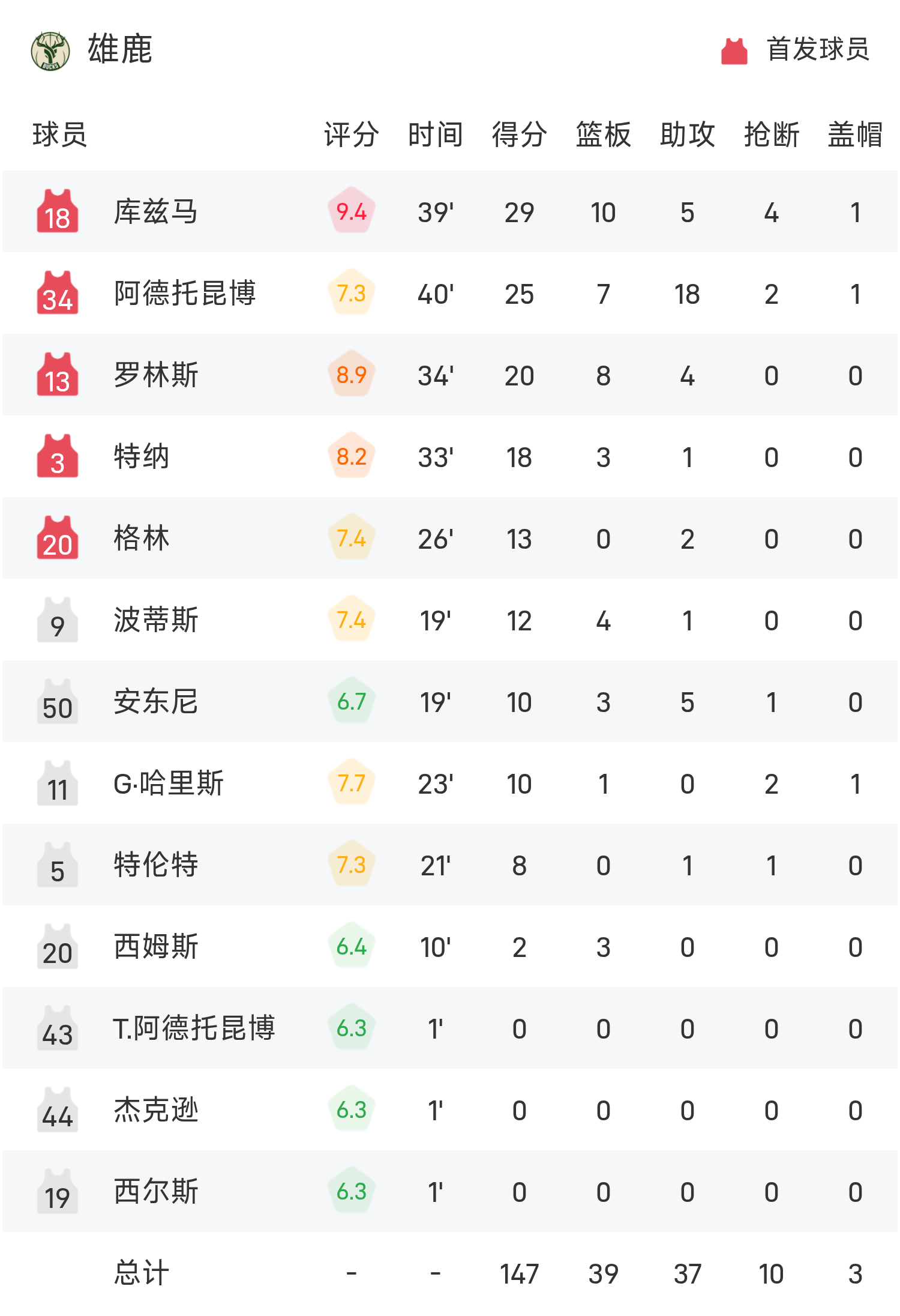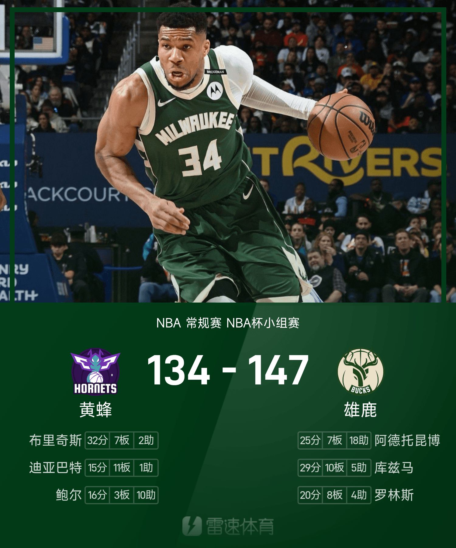 NBA战报:库兹马29分10板,雄鹿147-134延长赛击败黄蜂