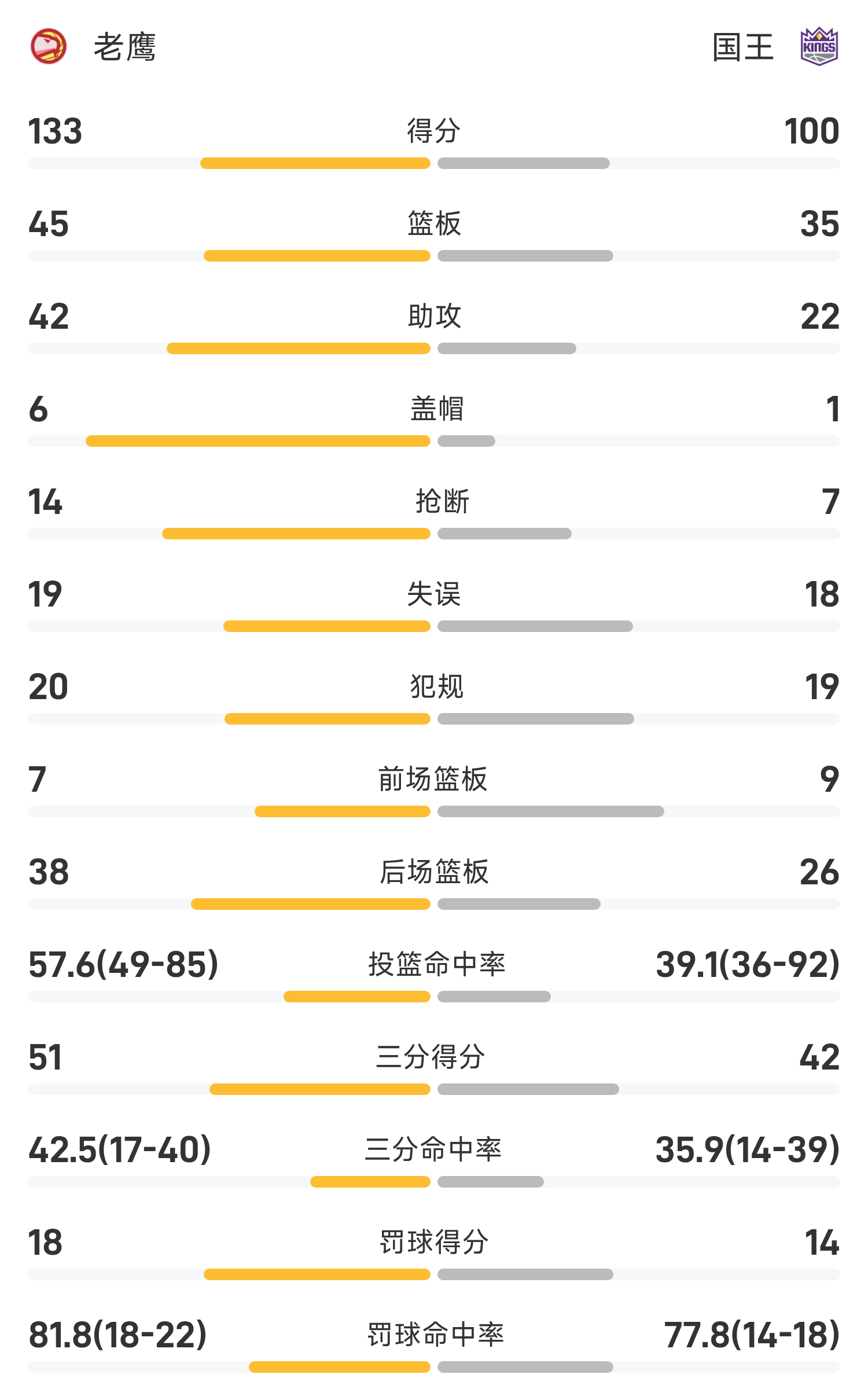 NBA战报:约翰逊24分10板8助,老鹰133-100狂胜国王