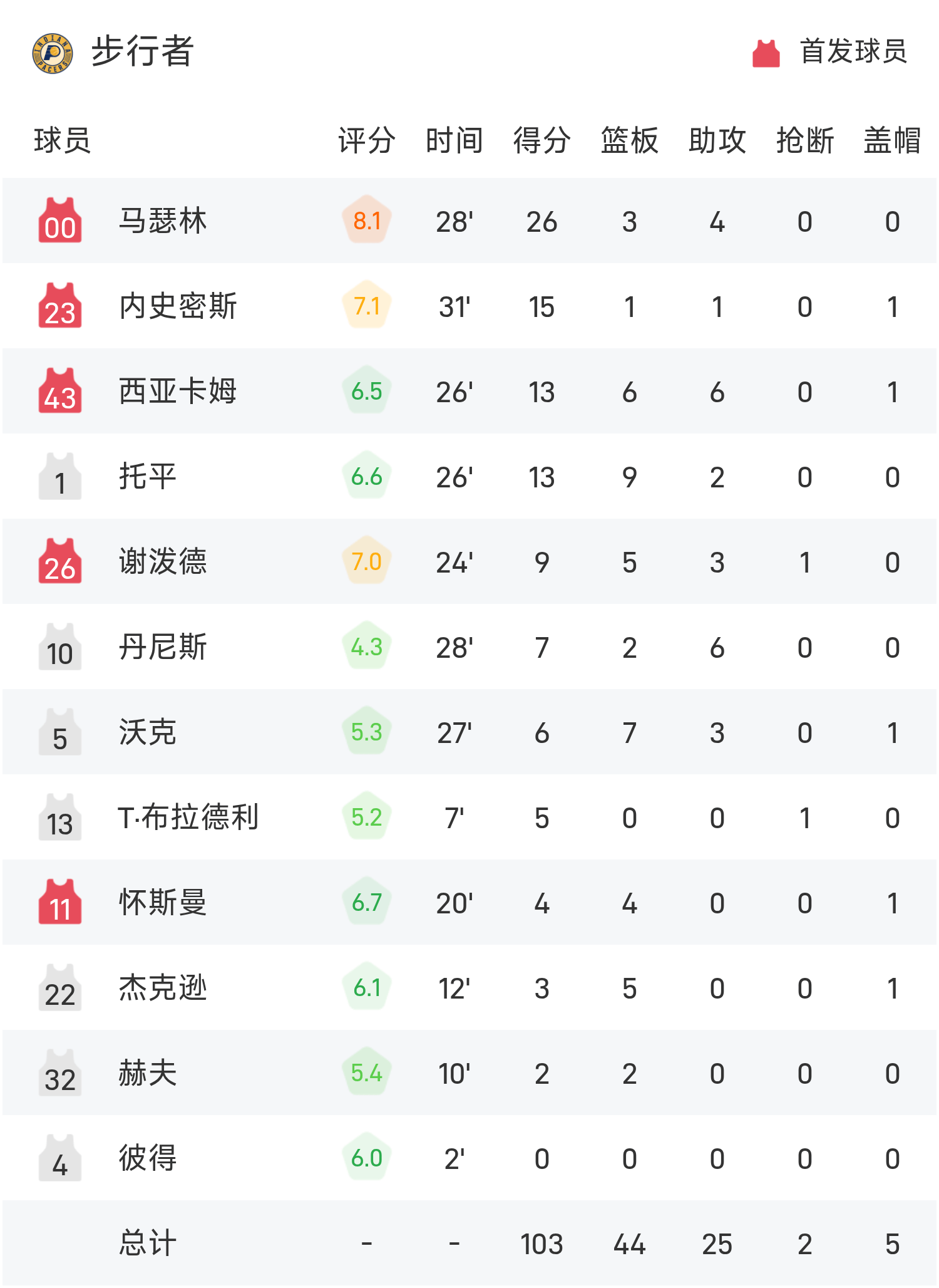 双方全场战罢,灰熊128-103战胜步行者。