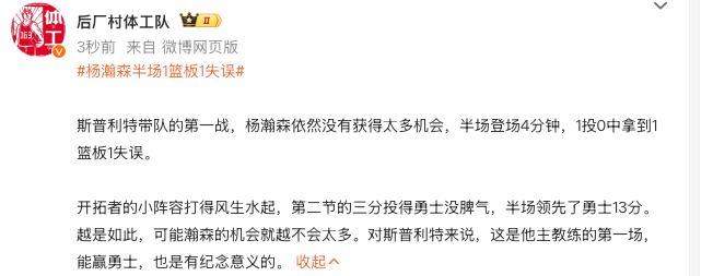 开拓者的小阵容打得风生水起,第二节的三分球投得勇士没脾气,半场领跑位了勇士13分。越是如此,可能瀚森的机会就越不会太多。对斯普利特来说,这是他主帅的第一场,能赢勇士,也是有纪念意义的。
