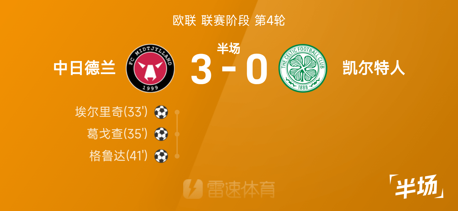 6686体育app11月07日讯 25/26赛季欧联联赛事阶段第4轮,中日德兰迎战凯尔特人。半场战罢,双方赛果分暂为中日德兰3-0凯尔特人,葛戈查发挥出色贡献1射1传。