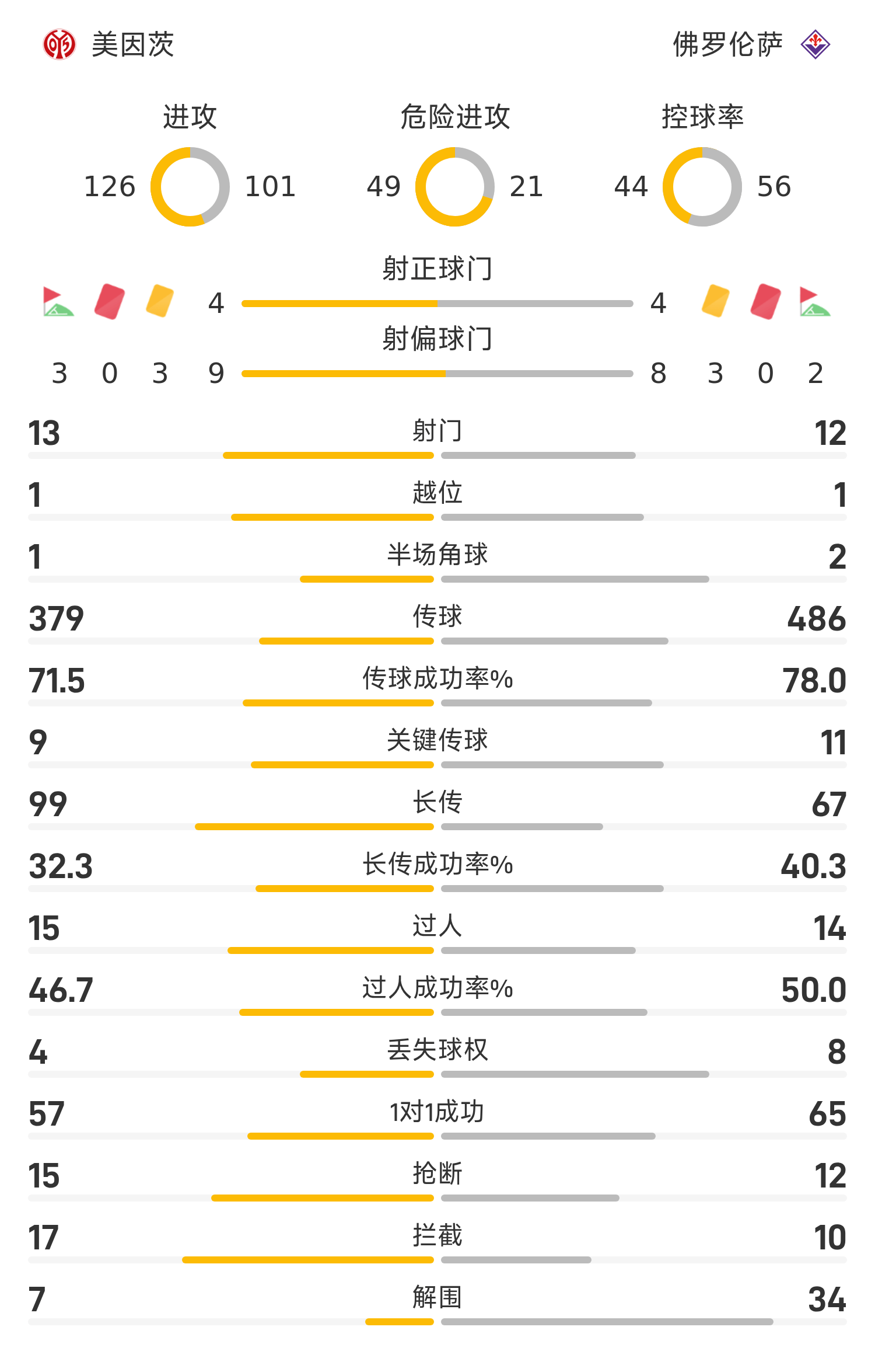 10’维皮尔三秒区顶球攻门,佛罗伦萨守门员将球没收