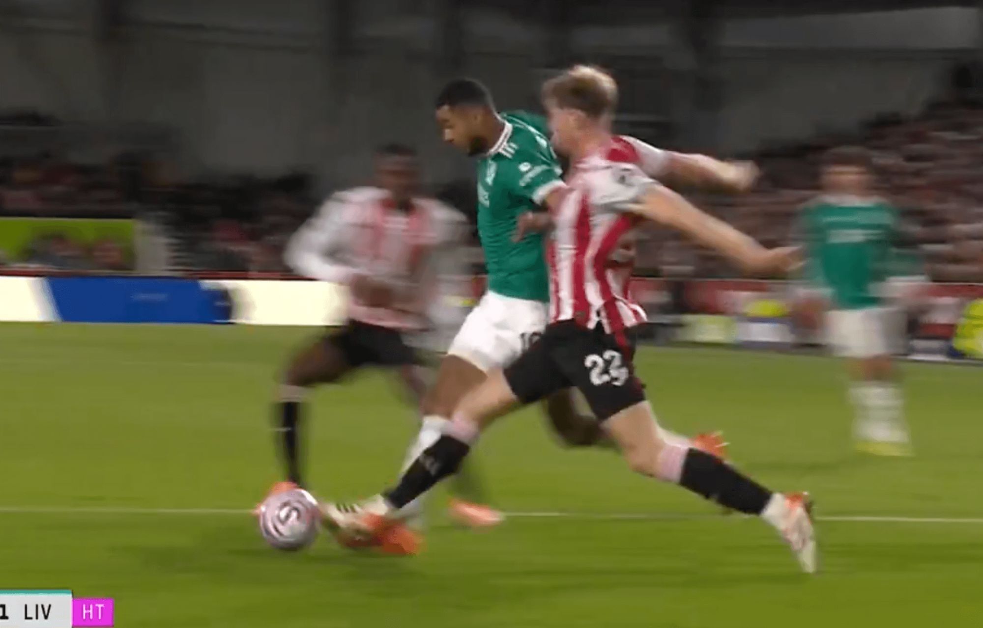 这个进球前发生了一连串混乱的事件。首先萨拉赫在左路对沙德违例,随后达姆斯高拿到球并迫使马马尔达什维利做出救球。布伦特福德将球发展到左路,瓦塔拉突破范戴克后被违例,地点看似在三秒区线外。