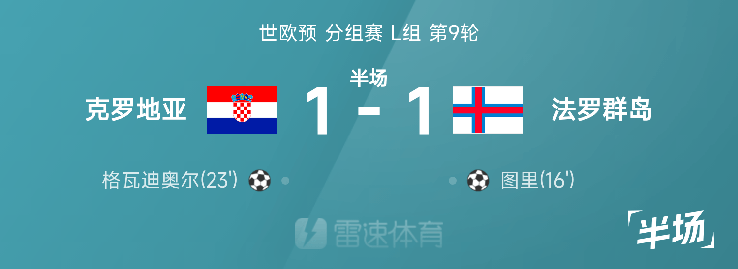 世欧预半场:图里破门,格瓦迪奥尔扳平,克罗地亚1-1法罗群岛