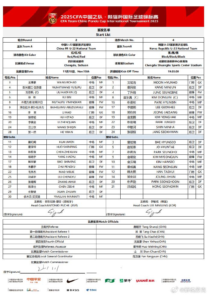 6686体育app11月15日讯 北京时间今日,熊猫杯第二轮,国足U22对阵韩国U22,赛前双方公布首发。