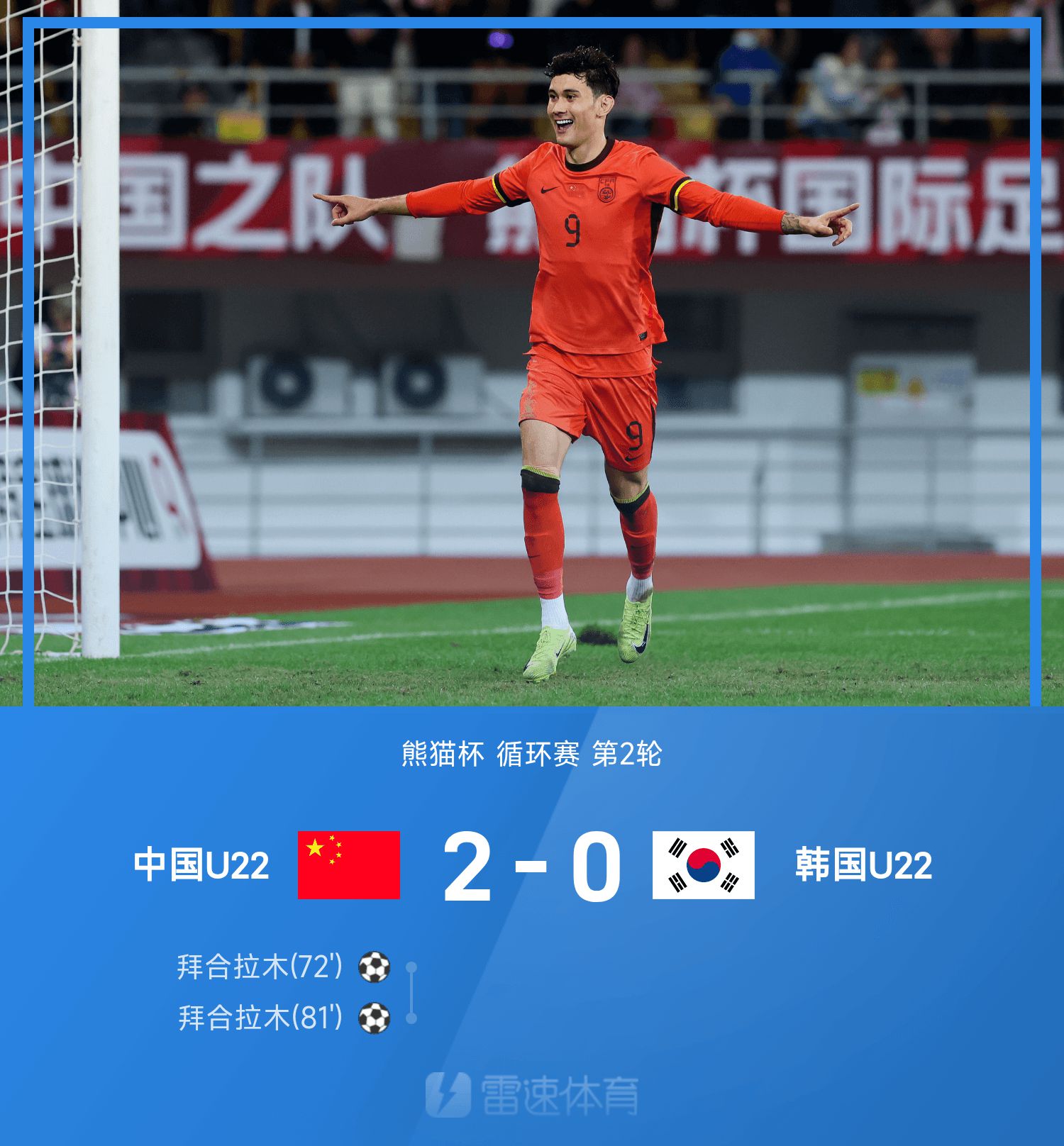 熊猫杯战报:拜合拉木梅开二度+脚后跟破门,中国2-0韩国