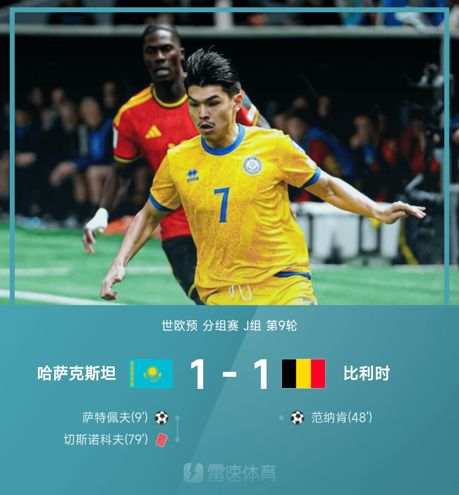 6686体育app11月15日讯 26赛季世欧预分组赛J组第9轮,哈萨克斯坦1-1战平比利时。上半场竞赛,萨特佩夫抓住泰特差错机会单刀破门,下半场范纳肯顶球破门扳平赛果分,随后比利时发起猛攻,切斯诺科夫蹬踏染红,但1-1的赛果分保持到终场,比利时无缘提前晋级世杯赛。