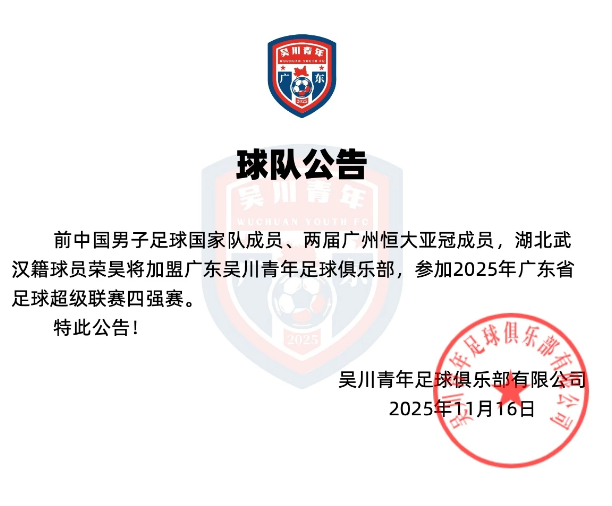 官方:荣昊加盟广东吴川青年,参加广东省足球超级联赛事四强赛