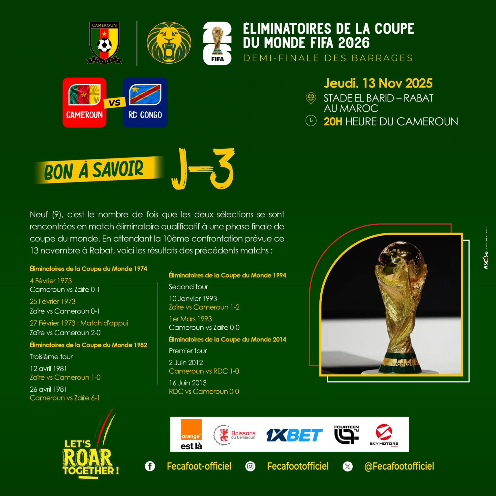 北京时间11月14日凌晨3:00,2026美加墨世杯赛资格赛非洲区资格赛附加赛,喀麦隆与民主刚果将在坐落于摩洛哥的阿尔巴里德比赛场展开较量。本场竞赛的胜者将与另一场竞赛中加蓬与尼日利亚之间的胜者争夺非洲区唯一一张洲际附加赛资格券。