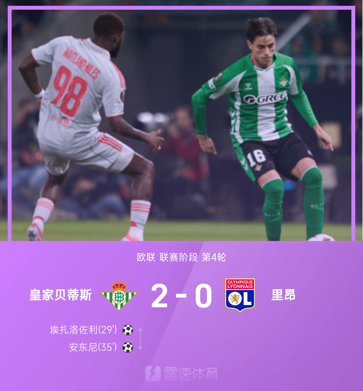 6686体育app11月07日讯 25/26赛季欧联联赛事阶段第4轮,皇家贝蒂斯对阵里昂。上半场第29分钟,巴坎布助攻埃扎洛佐利抢点破门,皇家贝蒂斯先拔头筹。第35分钟,罗卡自由球起大脚传,安东尼形成单刀冷静调射将赛果分改写成2-0。下半场两队均无建树,最终皇家贝蒂斯在主队场以2-0击败里昂。